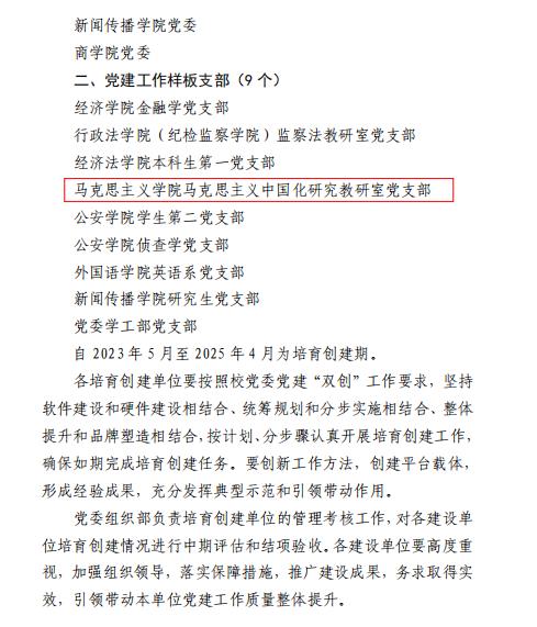 中国化研究教研室党支部申报的“党建工作样板支部”位列其中。