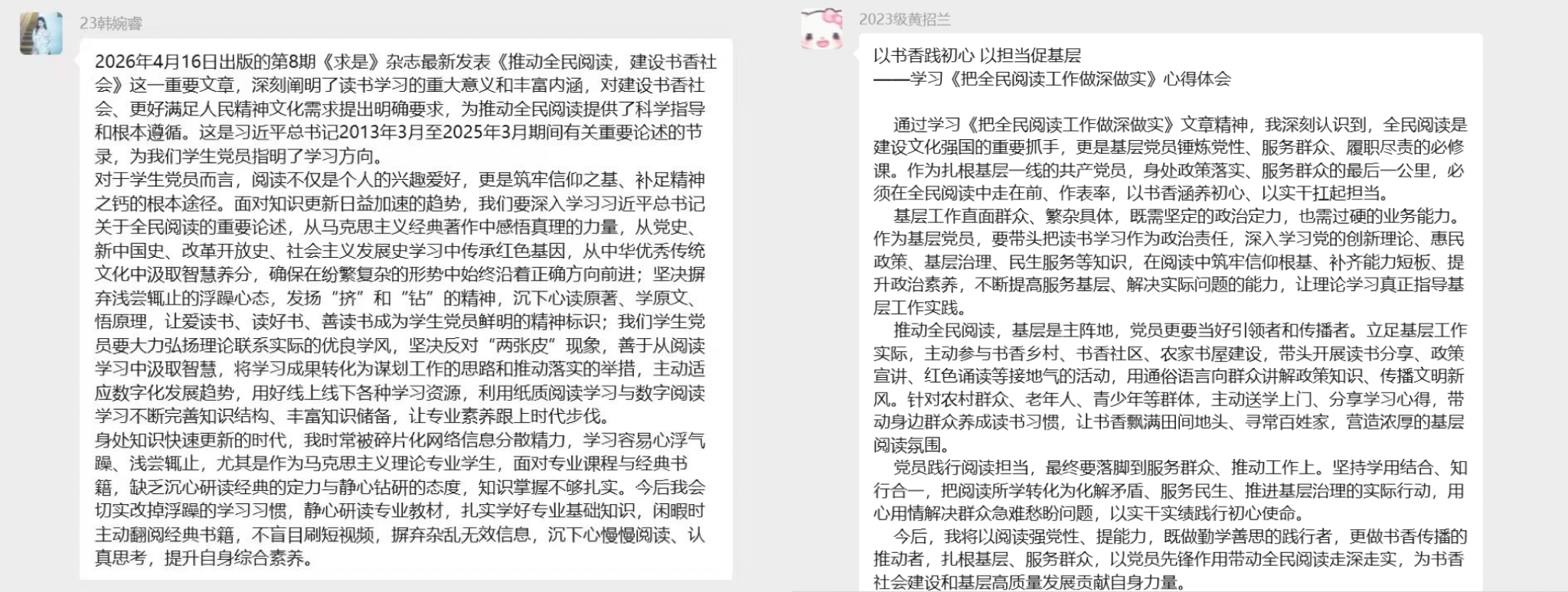 原理当作生活习惯和精神追求”的自觉意识。大家纷纷表示,要将本次学习成果转化为实际行动,以身作则,勤读善思,努力成为书香校园、书香社会的积极倡导者与先行实践者,在未来思政工作中播撒阅读的种子,为深化全民阅读贡献青春智慧与力量。