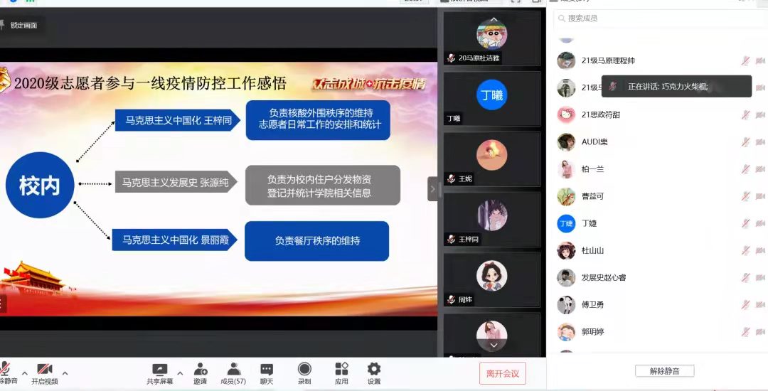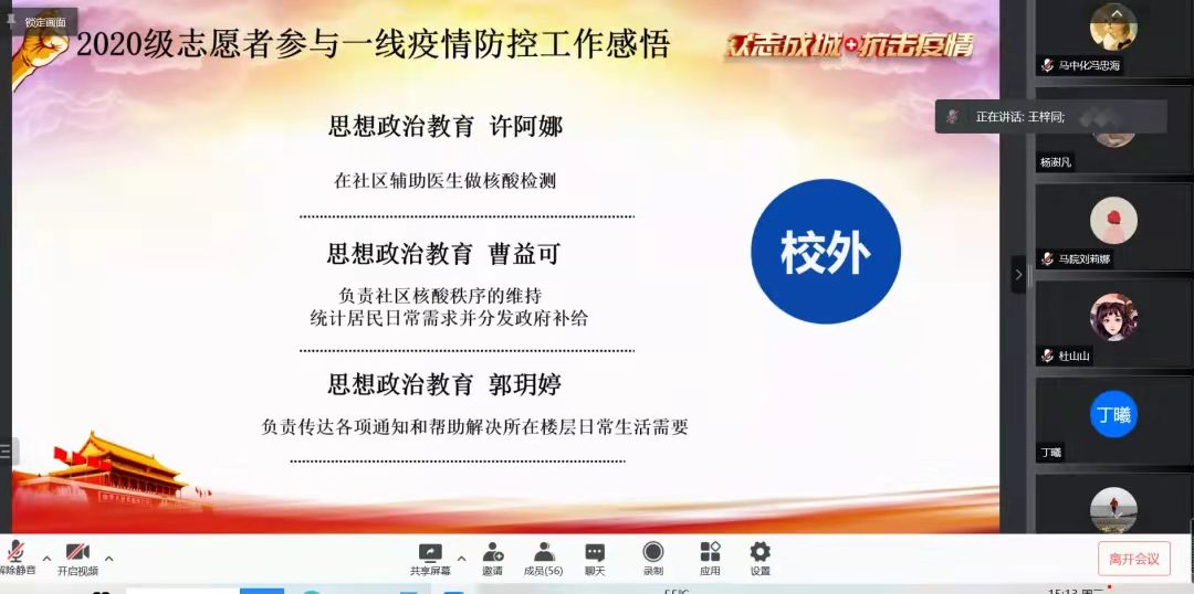 之后,2020级6名志愿者分享了参与校内外一线疫情防控工作的感悟。王梓同、张源纯和景丽霞三名同学分享了在校内负责核酸外围秩序的维持、志愿者日常工作的安排和统计、校内住户分发物资登记和统计做爱视频