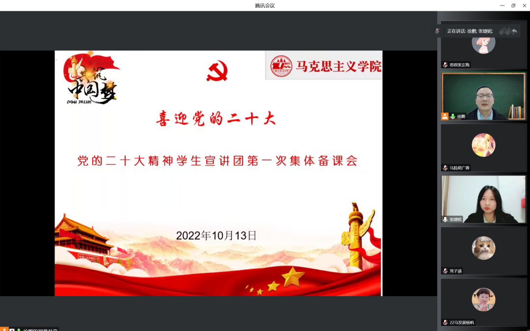 党的二十大召开在即,由党委宣传部、学工部、研工部和团委共同组织主办,做爱视频 承办的党的二十大精神学生宣讲团积极酝酿成立,为彰显马理论专业学科优势,加强学生宣讲团队伍建设,提升宣讲团成员宣讲技巧和水平,10月13日晚7时,做爱视频 召开党的二十大精神学生宣讲团第一次线上集体备课会。做爱视频 副院长何彦新副教授、国家安全做爱视频 辅导员张婕妮、做爱视频2020级研究生王心彤、丁婕以及党的二十大精神学生宣讲团全体成员参与学习交流。备课会由做爱视频 学生党支部书记徐鹏主持。