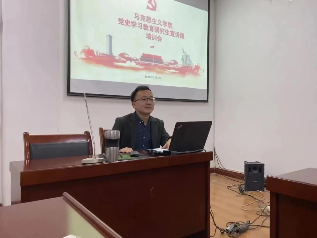 于4月7日晚七点在文化与价值研究院会议室开展党史学习教育研究生宣讲团培训会。参加培训会的有党总支组织员兼学生党支部书记徐鹏及35名宣讲团成员。培训会由学生会执行主席张婕妮主持。