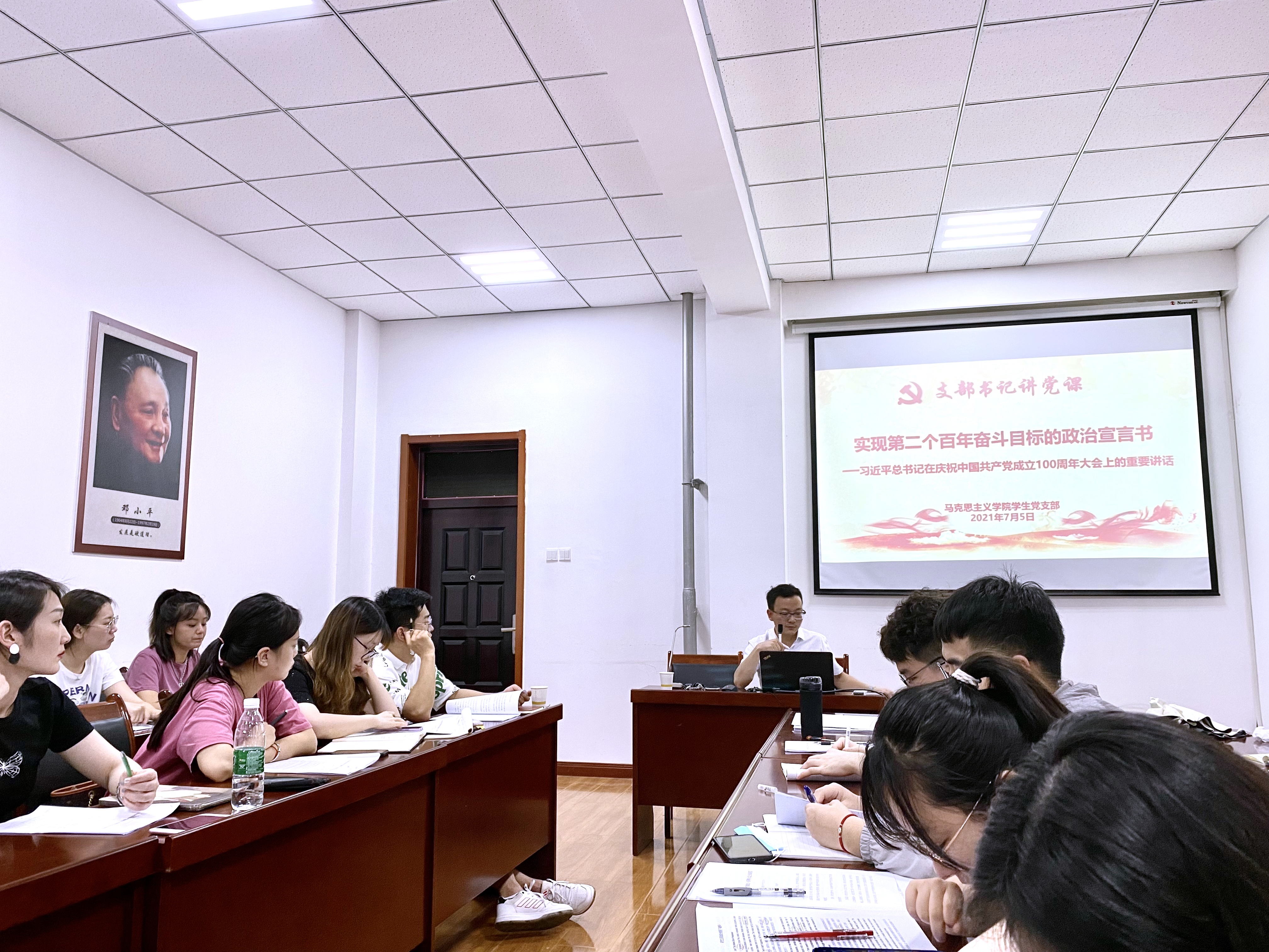 7月5日晚19时,做爱视频 学生党支部在雁塔校区文化与价值哲学研究院会议室召开了“支部书记讲党课——学习习近平总书记在庆祝中国共产党成立100周年大会上的重要讲话”专题学习会。学生党支部全体成员和部分入党积极分子参加了本次会议。会议由做爱视频 组织员、学生党支部书记徐鹏主持。