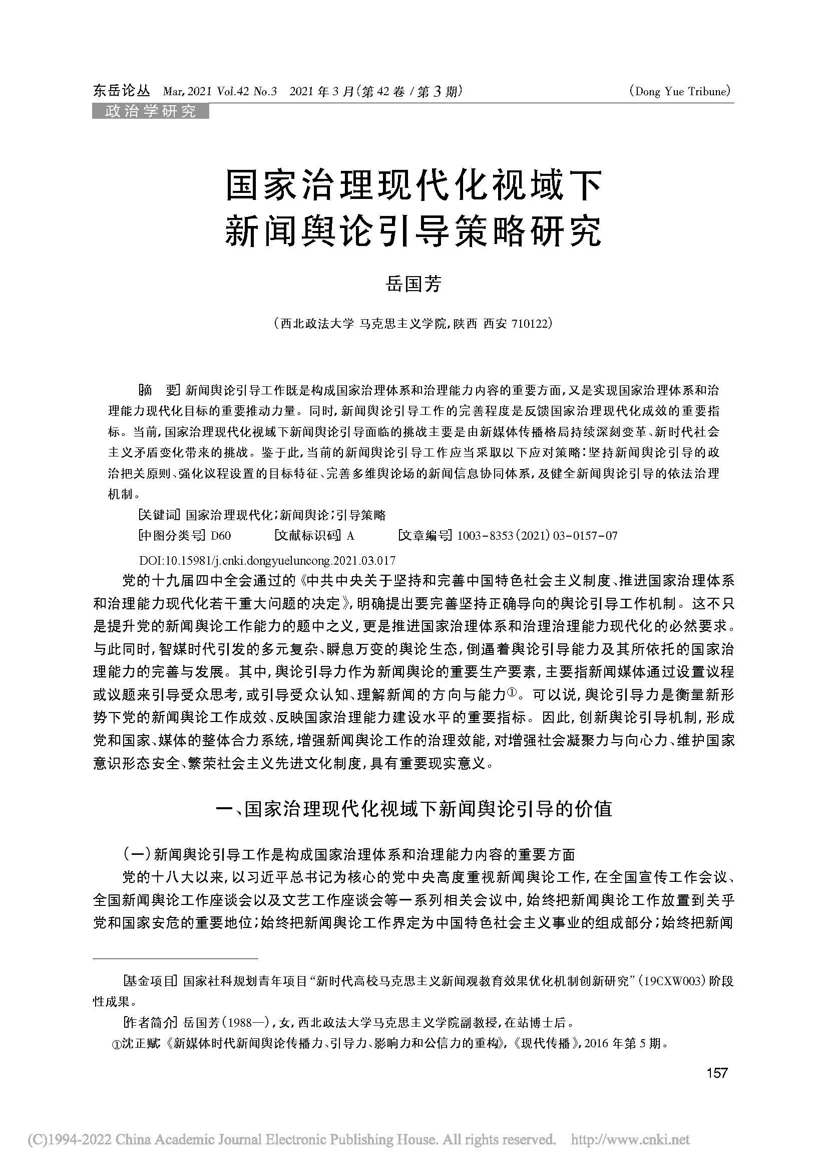 近日,陕西省教育厅公布了2024年陕西高校人文社会科学研究优秀成果获奖名单,做爱视频 岳国芳副教授的论文《国家治理现代化视域下新闻舆论引导策略研究》荣获论文类三等奖。该论文发表于《东岳论丛》2021年第3期。