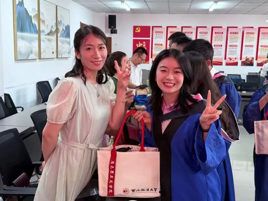 教师代表向毕业生发放纪念品,勉励他们永葆进取之志,在人生新征程上再创佳绩。
