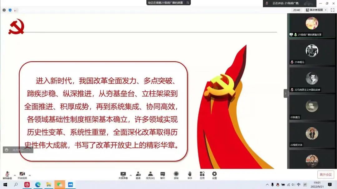 活动中,胡广蓉同学从三个方面带领同学们认识新时代的伟大成就。首先,从改革开放的历史进程中认识新时代的伟大成就。中国特色社会主义新时代是继续坚持并拓展中国特色社会主义道路的新时代,是继续坚持并不断完善中国特色社会主义制度的新时代。其次,从党的十八大以来的理论创新和丰富实践中认识新时代的伟大成就。在充分认识习近平新时代中国特色社会主义思想的地位与创新意义的基础上,重点把握习近平新时代中国特色社会主义思想围绕“十个明确”而展开的理论创新。最后,从民族复兴伟业的推进中认识新时代的伟大成就。习近平总书记指出,新时代党领导人民创造的伟大成就,为实现中华民族伟大复兴提供了更为完善的制度保证、更为坚实的物质基础、更为主动的精神力量。这三个“更为”,揭示了新时代伟大成就的历史地位、现实意义。