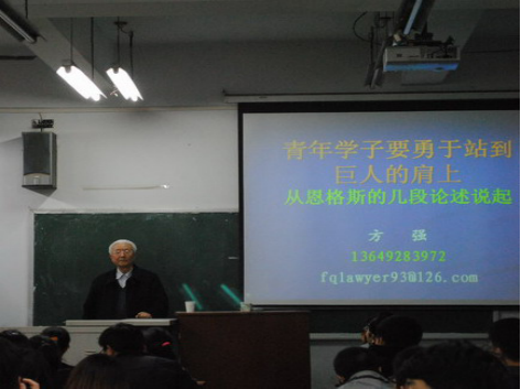 是人类认识自身和世界的伟大科学成果,青年学子要珍惜它、学习它、研究它、修正它、发展它,然后以恩格斯《反杜林论》中的几处经典论述为依据,详细讲述了“心理行为逻辑模型”的基本含义及其广泛应用,讲解了经济基础与上层建筑相互作用的“三角运动规律”和创建政治力学的创意。方教授告诉青年学子们,我们要有理论勇气,后人要站在前人尤其是巨人的肩上,人类才能与时俱进,这就是人类进步的规律。方教授还特别强调,青年学子只要全面精读经典作家的原著,加以消化,并向新的领域创造性的应用,就能有所发现、有所前进、所向无敌。方强教授的报告深入浅出、举例分析、内容丰富、博得了师生阵阵掌声……