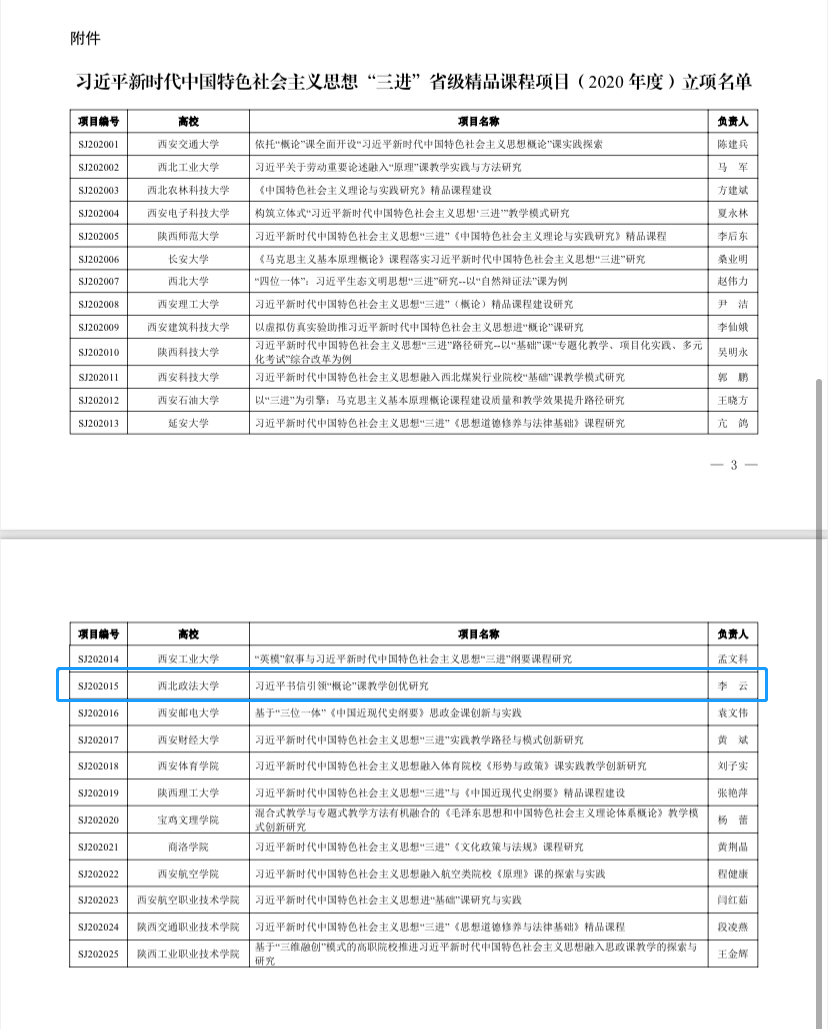 由做爱视频李云教授主持论证的《习近平书信引领“概论”课教学创优研究》项目成功立项中共陕西省委教育工委关于习近平新时代中国特色社会主义思想“三进”省级精品课程项目(2020年度),获批经费2万元。