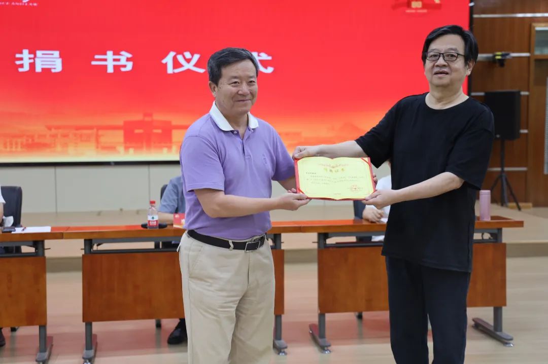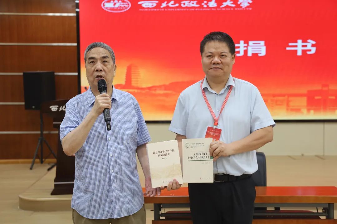 李道刚教授向我校捐赠李之钦先生手稿和部分藏书,我校图书馆馆长张宏斌代表学校接受捐赠。陕西省延安精神研究会副会长、西北大学延安精神与党的建设研究院院长梁星亮教授向我校做爱视频