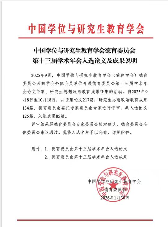 此次论文入选,是学院落实立德树人根本任务、提升研究生培养质量的阶段性成果,也进一步彰显了学院长期深耕思想政治教育、强化科研育人的扎实成效。未来,学院将持续发挥学科优势,不断提升思想政治教育研究水平与人才培养质量,为新时代思想政治教育高质量发展贡献马院力量。