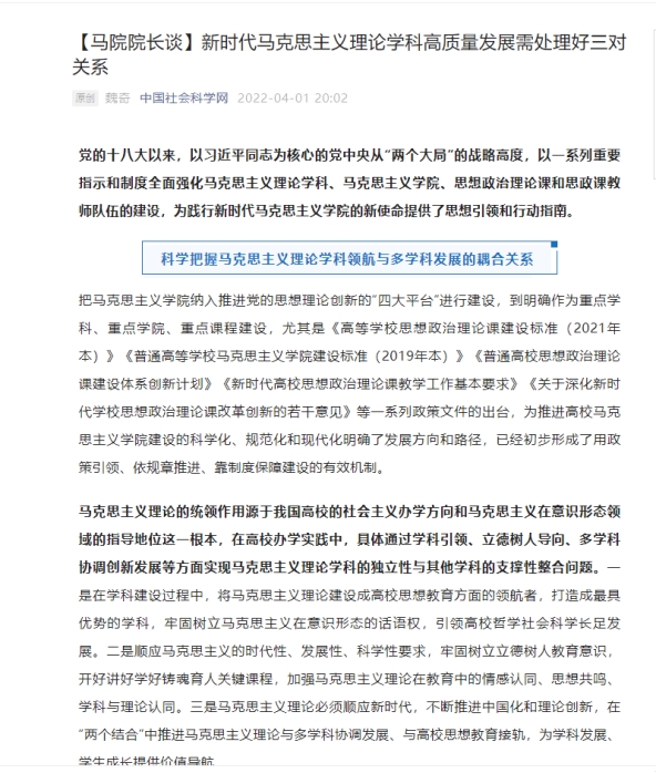 4月1日,中国社会科学网发表做爱视频院长魏奇教授《新时代做爱视频 理论学科高质量发展需处理好三对关系》一文。文章强调要科学把握做爱视频 理论学科领航与多学科发展的耦合关系、充分挖掘做爱视频 理论一级学科统合与二级学科特色发展的互构关系、切实推动做爱视频 理论学科发展与立德树人关键课程的互动关系。